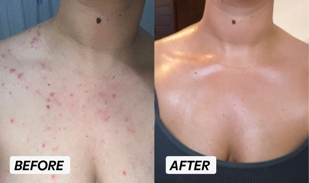 "I had terrible chest acne, bum spots and bacne.The inflammation went down in the first few days and in 2 weeks the scars faded. A few months in my skin is totally clear and glowing"